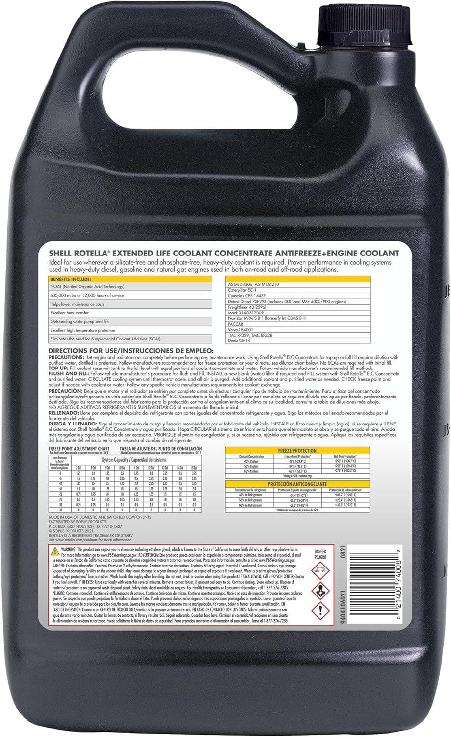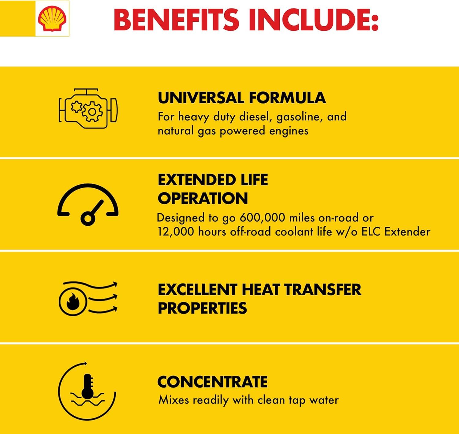 Developed to provide complete protection of all cooling system components, Shell Rotella ELC Extended Life Antifreeze/Coolant (Concentrate) is a carboxylate based coolant for heavy duty diesel, gasoline, and natural gas powered engines. The inhibitors in Shell Rotella ELC are designed to go 600,000 miles on-road or 12,000 hours off-road. Featuring excellent heat transfer and pitting protection for wet sleeve cylinder liners, it also works to reduce hard water scale and overall coolant and coolant component maintenance. It requires no traditional ELC Extender or supplemental coolant additive (SCA) additions and contains no silicate borate, nitrate or phosphate. Shell Rotella ELC has excellent, long-term corrosion protection of all cooling system metals including aluminum, brass, cast iron, steel, solder, and copper. Meets or exceeds the following OEM requirements: Phosphate free requirement of European OEMs; silicate free requirement of Japanese OEMs; Detroit Diesel DFS 93K217; Volvo/Mack; Paccar; Deutz DQC CB-14; CAT EC-1; Cummins CES 14439; Navistar MPAPS B-1 (formerly Int CEMS B-1). Meets or exceeds the requirements of the following industry specifications: ASTM D3306, D4985, D6120; TMC RP 329, RP 338. For a full listing of equipment approvals and recommendations, please consult your local Shell Technical Helpdesk.