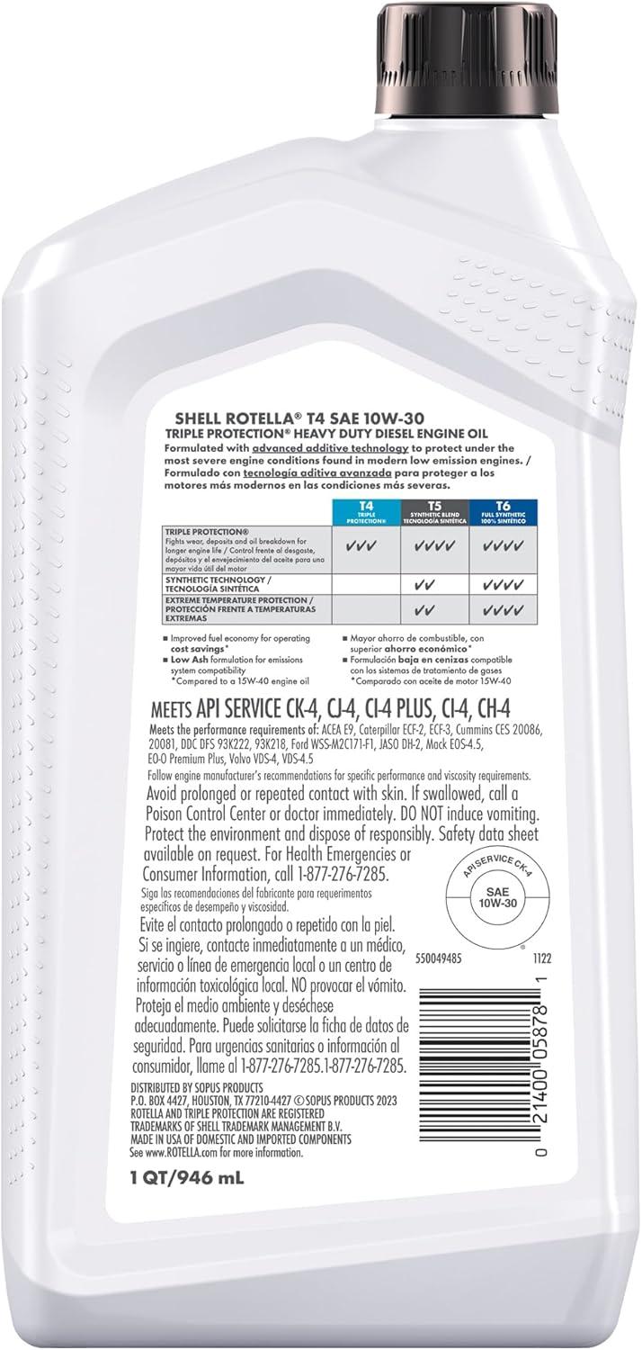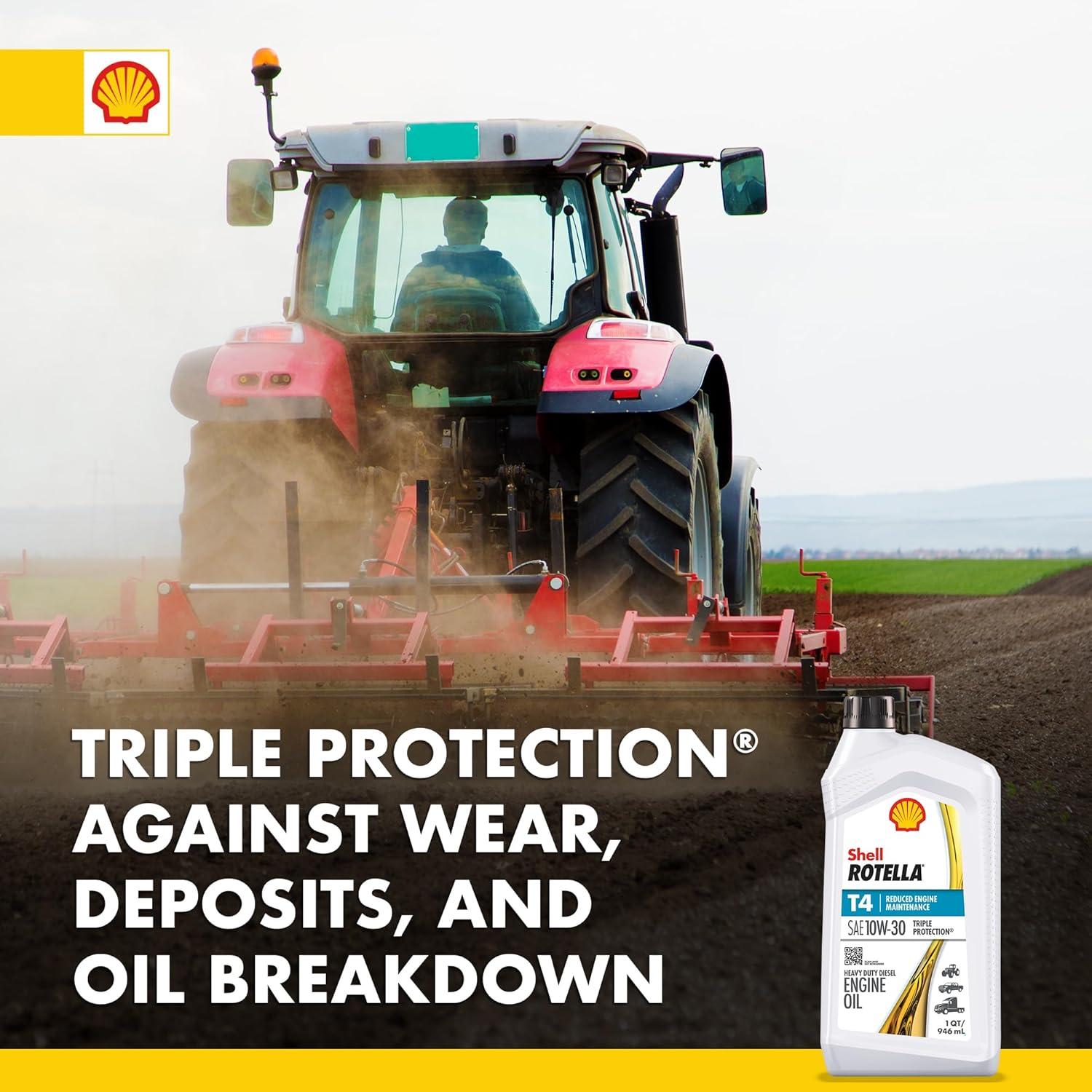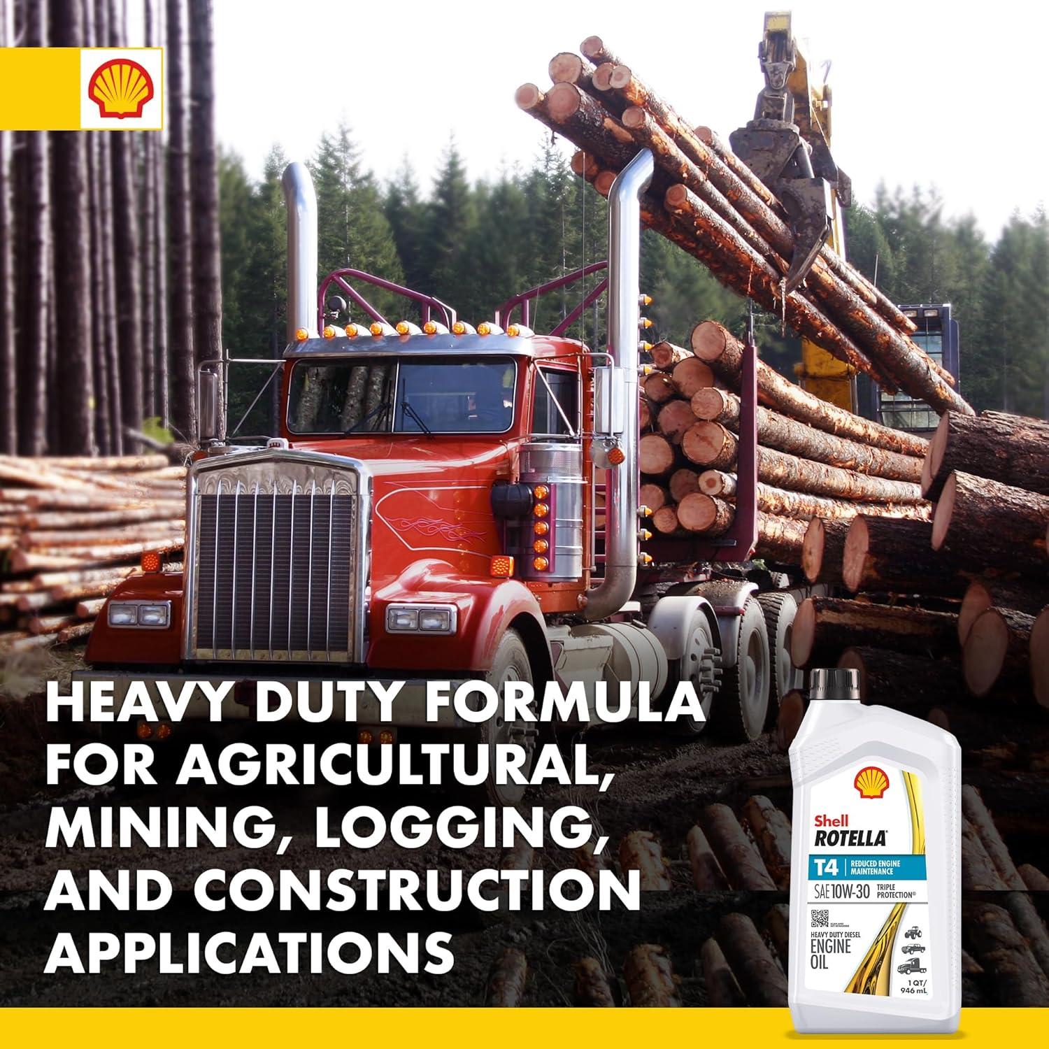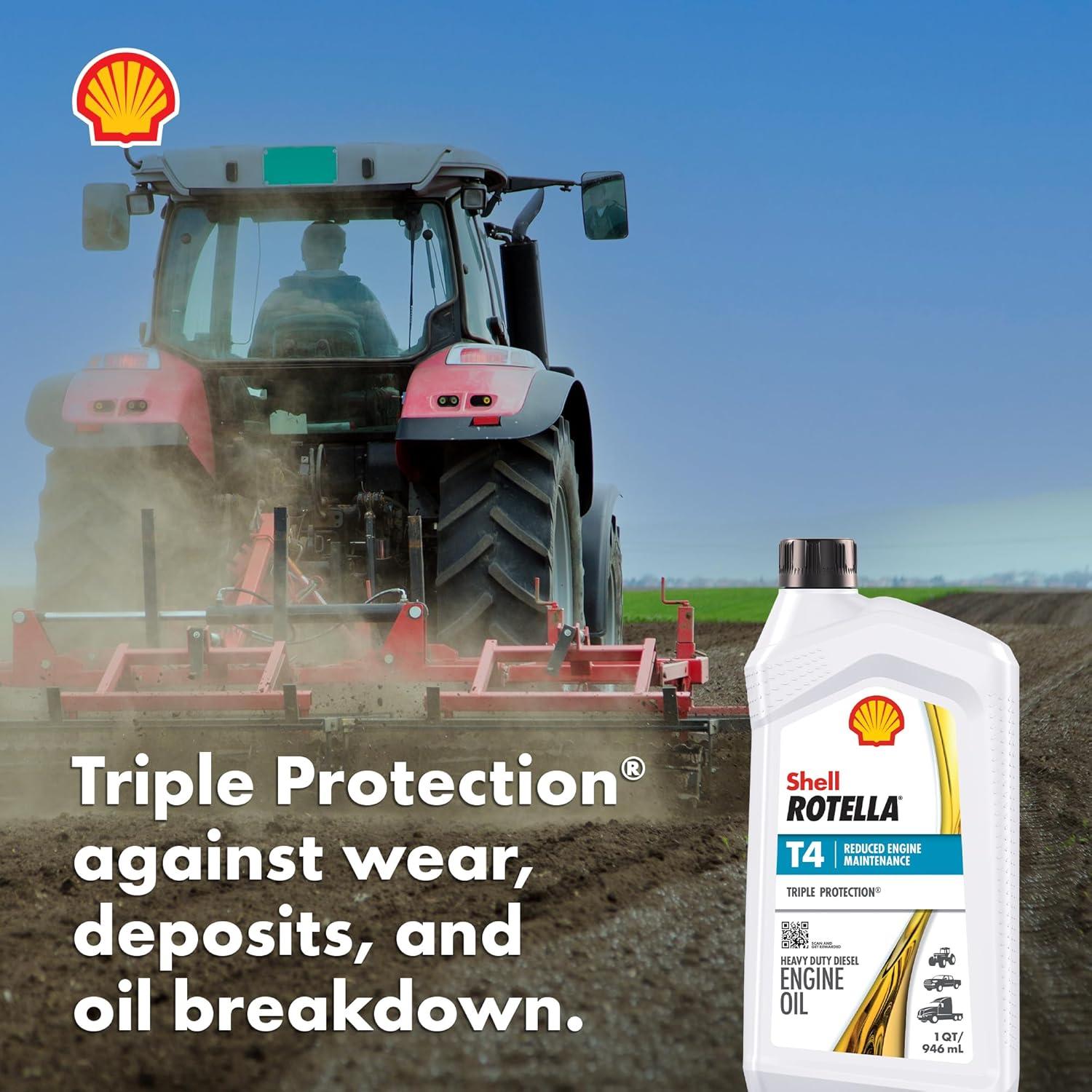 Shell Rotella T4 Triple Protection 15W-40 diesel engine oil provides significantly better wear protection than previous generation oils to maximize engine efficiency and prolong engine life in a wide range of heavy-duty engines. It uses advanced additive technology to protect under the most severe conditions found in modern, low-emission engines and older hard-working diesel engines. Shell Rotella T4 15W-40 engine oil provides enhanced deposit protection to help keep engines cleaner over the oil drain interval. It effectively sustains emissions control compatibility with an exclusive low ash formulation that helps protect the exhaust catalysts and particulate filters found on the latest low-emission vehicles. Plus, it provides enhanced shear stability performance for viscosity control and optimal oil pressure in your engine. Shell Rotella T4 15W-40 has a proven legacy of performance and is suitable for a wide range of heavy-duty engine applications, including on-highway fleets, general haul, agricultural, mining, logging, construction, diesel pickup trucks, and vehicles requiring resistance to increased heat and stress.