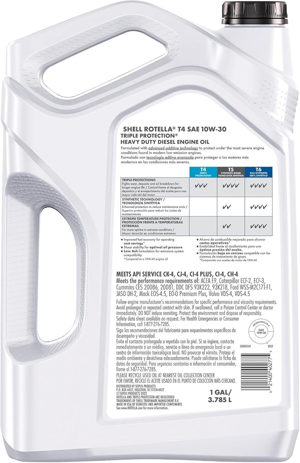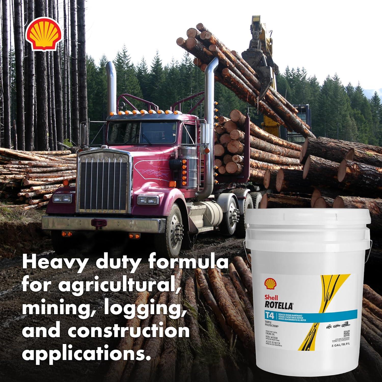 Shell Rotella T4 Triple Protection 15W-40 diesel engine oil provides significantly better wear protection than previous generation oils to maximize engine efficiency and prolong engine life in a wide range of heavy-duty engines. It uses advanced additive technology to protect under the most severe conditions found in modern, low-emission engines and older hard-working diesel engines. Shell Rotella T4 15W-40 engine oil provides enhanced deposit protection to help keep engines cleaner over the oil drain interval. It effectively sustains emissions control compatibility with an exclusive low ash formulation that helps protect the exhaust catalysts and particulate filters found on the latest low-emission vehicles. Plus, it provides enhanced shear stability performance for viscosity control and optimal oil pressure in your engine. Shell Rotella T4 15W-40 has a proven legacy of performance and is suitable for a wide range of heavy-duty engine applications, including on-highway fleets, general haul, agricultural, mining, logging, construction, diesel pickup trucks, and vehicles requiring resistance to increased heat and stress.