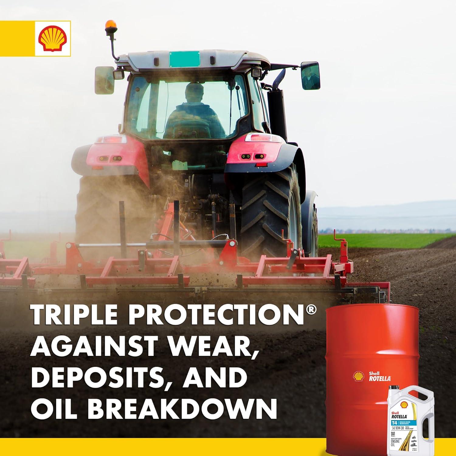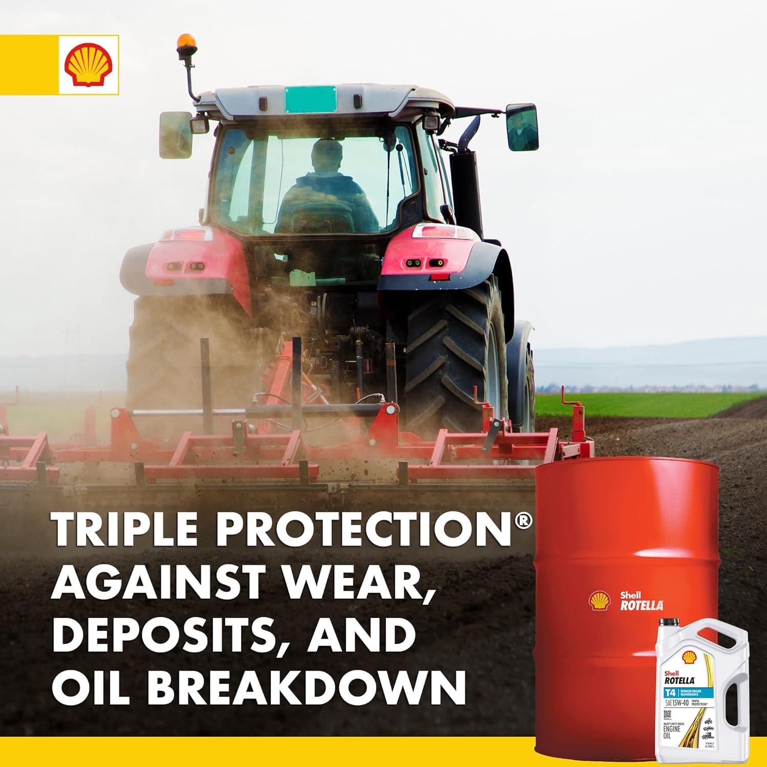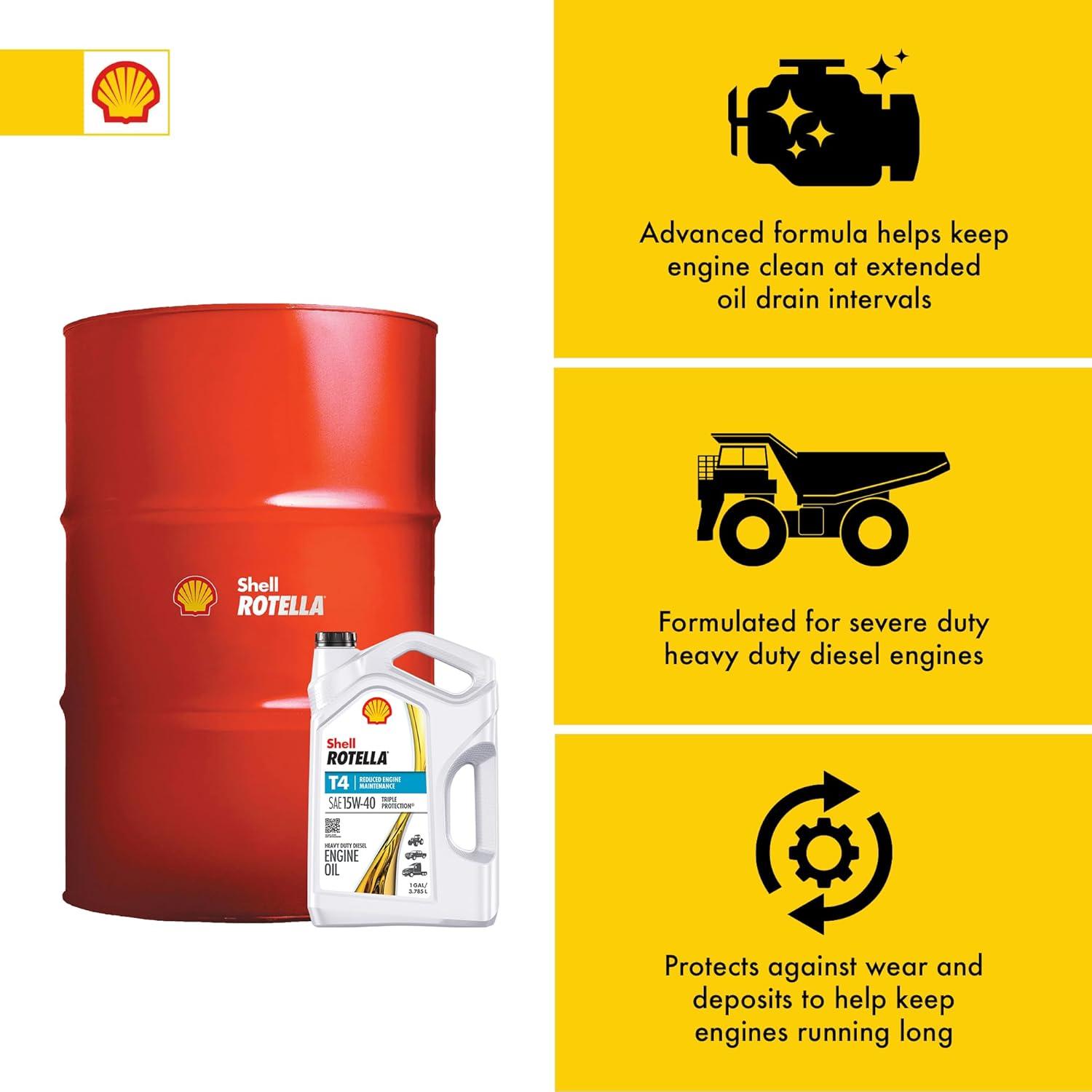 Shell Rotella T4 Triple Protection 15W-40 diesel engine oil provides significantly better wear protection than previous generation oils to maximize engine efficiency and prolong engine life in a wide range of heavy-duty engines. It uses advanced additive technology to protect under the most severe conditions found in modern, low-emission engines and older hard-working diesel engines. Shell Rotella T4 15W-40 engine oil provides enhanced deposit protection to help keep engines cleaner over the oil drain interval. It effectively sustains emissions control compatibility with an exclusive low ash formulation that helps protect the exhaust catalysts and particulate filters found on the latest low-emission vehicles. Plus, it provides enhanced shear stability performance for viscosity control and optimal oil pressure in your engine. Shell Rotella T4 15W-40 has a proven legacy of performance and is suitable for a wide range of heavy-duty engine applications, including on-highway fleets, general haul, agricultural, mining, logging, construction, diesel pickup trucks, and vehicles requiring resistance to increased heat and stress.