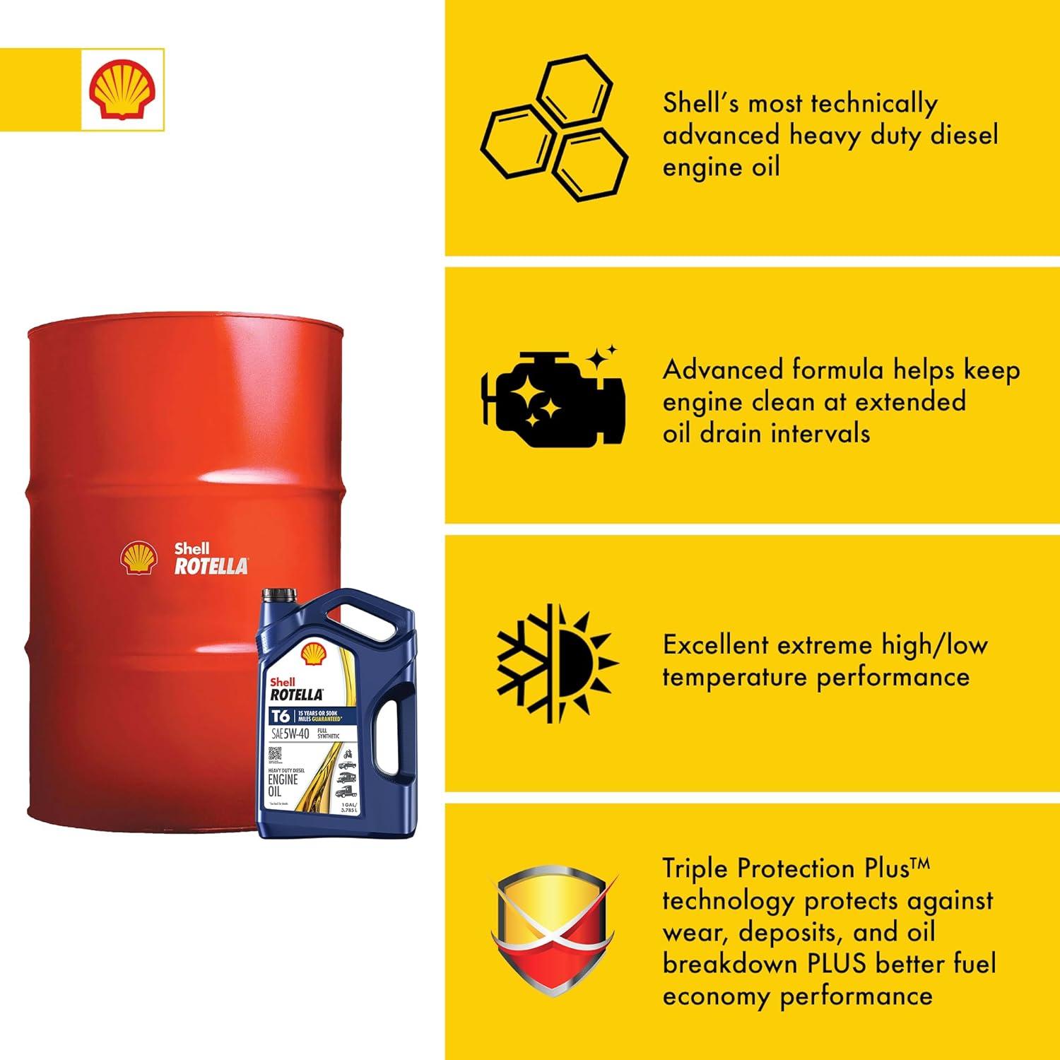 Shell Rotella T6 15W-40 diesel engine oil is a full synthetic motor oil that features exclusive Triple Protection Plus technology, formulated with fully synthetic base oils plus advanced additives to protect against wear, deposits, and oil breakdown. It offers better cold cranking properties and low-temperature pumpability at -15C compared to conventional and synthetic blend Shell Rotella 15W-40 products. It also delivers improved wear performance versus API CJ-4 technology, extended drain capabilities for more uptime, improved protection against oxidation for increased fuel economy, compatibility with exhaust emissions control systems, and protection in extreme operating conditions and climates. Shell Rotella T6 15W-40 is suitable for use in new and older diesel-powered vehicles, from Class 8 tractor/trailers to heavy-duty pickups and delivery, utility, and school bus fleets. Shell Rotella T6 is backed by a limited warranty valid up to 15 years or 500,000 miles (whichever comes first), guaranteed*. (*Shell Rotella Limited Warranty: Up to 15 years or 500,000 miles, whichever comes first, guaranteed, if you exclusively use Shell Rotella T6 Full Synthetic heavy-duty engine oil and meet enrollment mileage and vehicle manufacture date requirements. Enrollment required. Keep your receipts. Other conditions apply. See Rotella.com/warranty to enroll and for full details and terms.)